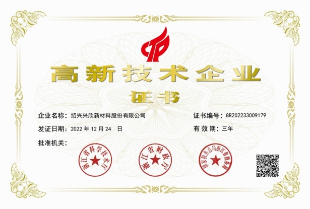 紹興興欣新材料股份有限公司成立于2002年06月27日,占地面積122畝,位于杭州灣上虞經(jīng)濟(jì)技術(shù)開發(fā)區(qū)拓展路2號,現(xiàn)有職工200余人,專業(yè)技術(shù)人員50余人;博士、碩士研究生30余人組成的一支知識型、專業(yè)化的技術(shù)科研團(tuán)隊。公司面向全球市場,專業(yè)開發(fā)電子化學(xué)品、環(huán)保化學(xué)品、醫(yī)藥中間體、高分子材料等先進(jìn)新材料重點(diǎn)領(lǐng)域的省級科技型企業(yè);建有浙江上虞、安徽東至兩個生產(chǎn)基地。目前為“國家高新技術(shù)企業(yè)”、浙江省“隱形冠軍”企業(yè)、浙江省專精特新中小企業(yè);建有“省級”研究開發(fā)中心,共建天津大學(xué)浙江紹興研究院電子化學(xué)品研發(fā)中心。